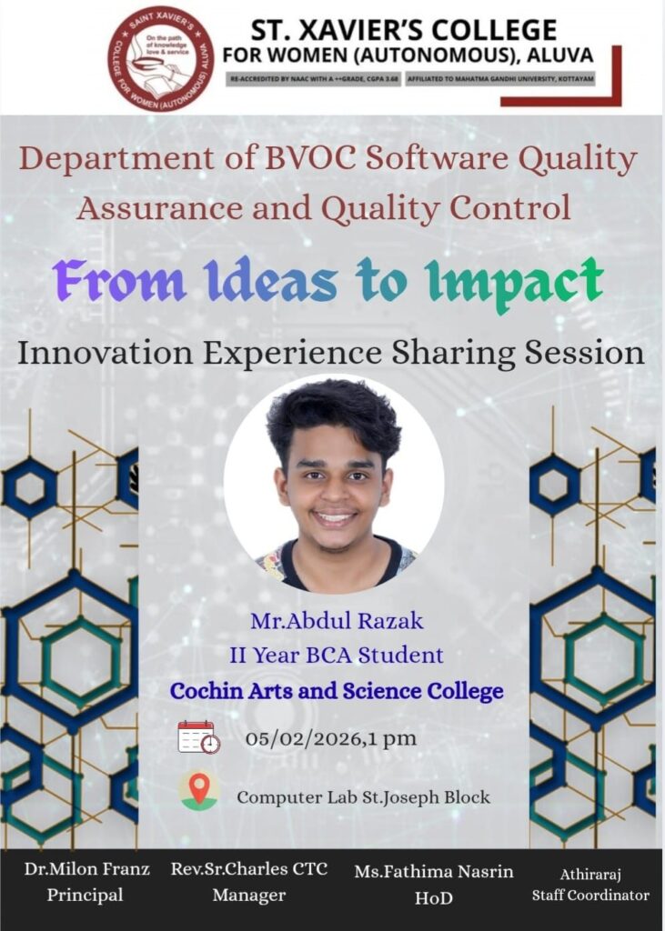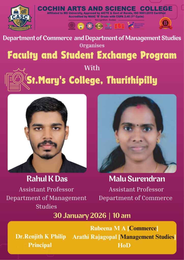 The Department of Commerce organized an internship programme for S6 students at Invisor Consulting Services Pvt. Ltd., Infopark, Kakkanad, on 09 January 2026, from 10:00 AM to 1:30 PM. The programme was designed to bridge the gap between academic learning and industry practice by exposing students to real-world corporate and consulting environments.The interaction with industry […]