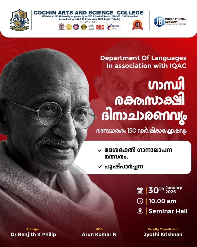 The Department of Languages, in association with IQAC, Cochin Arts and Science College, organized a National Song Competition in connection with the 150th anniversary of “Vande Mataram”, the song that inspired the Indian freedom movement. The event was held on 30 January 2026 at 10.00 a.m. in the Seminar Hall. The programme aimed to instill […]