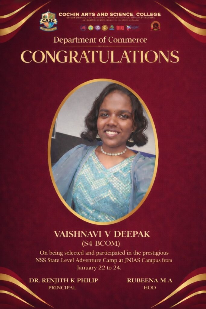 Congratulations to Vaishnavi V Deepak (S4 B.Com) for being selected and participating in the NSS State Level Adventure Camp held at JNIAS Campus from 22 to 24 January. Her participation reflects dedication, leadership, and active involvement in co-curricular activities, bringing pride to the institution.