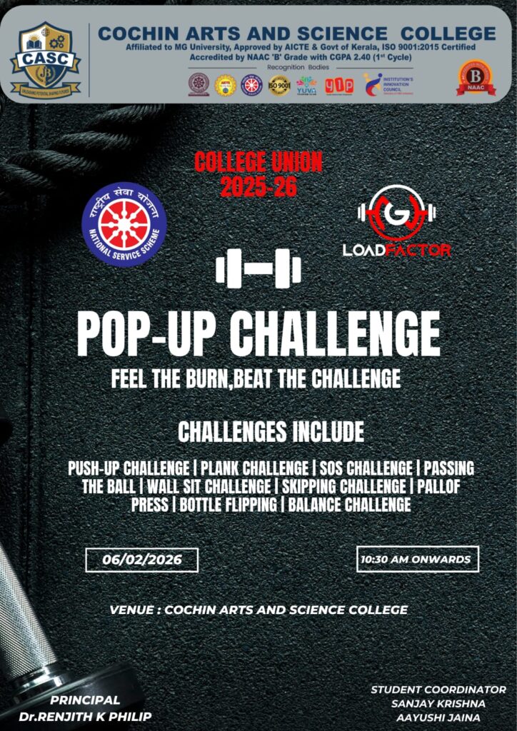 Cochin Arts and Science College, under the auspices of the College Union 2025–26, in collaboration with NSS and Load Factor, organizes a Pop-Up Fitness Challenge aimed at promoting physical fitness, teamwork, and active campus engagement among students. The event features a series of short, high-energy fitness and coordination challenges including push-ups, planks, wall sits, skipping, […]