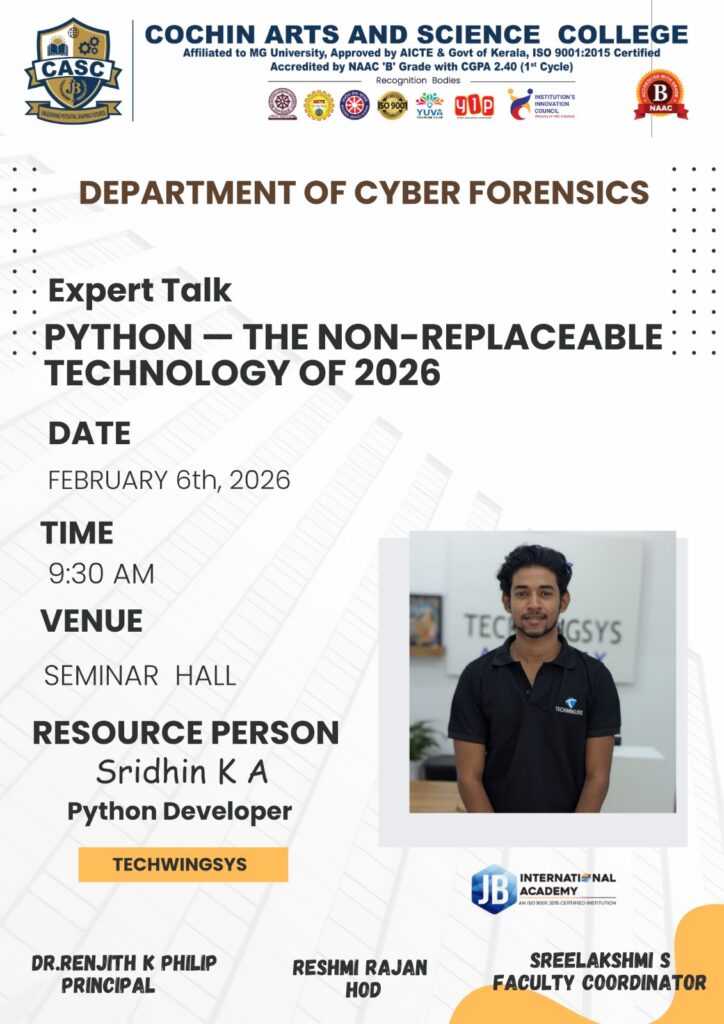 The Department of Cyber Forensics, Cochin Arts and Science College, is organizing an Expert Talk on “Python – The Non-Replaceable Technology of 2026” to provide students with insights into the growing significance of Python in modern computing and emerging technologies. The session will highlight Python’s role in areas such as cybersecurity, data analysis, automation, and […]