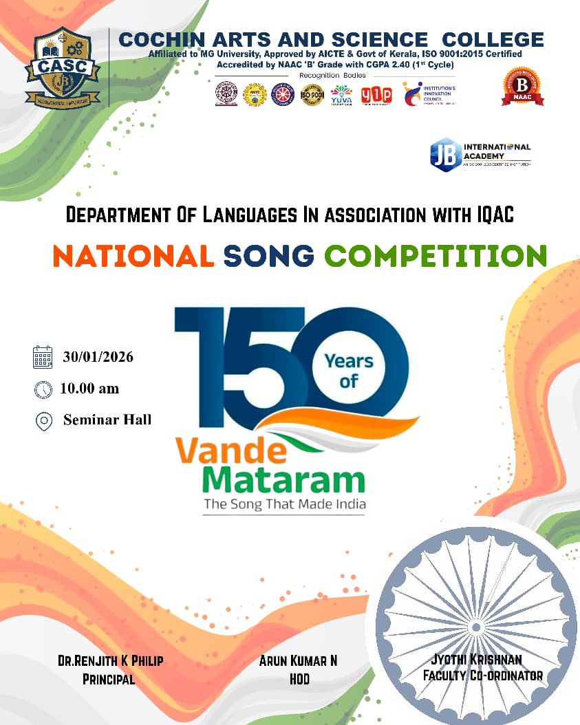 The Department of Languages, in association with IQAC, Cochin Arts and Science College, organized a National Song Competition in connection with the 150th anniversary of “Vande Mataram”, the song that inspired the Indian freedom movement. The event was held on 30 January 2026 at 10.00 a.m. in the Seminar Hall.