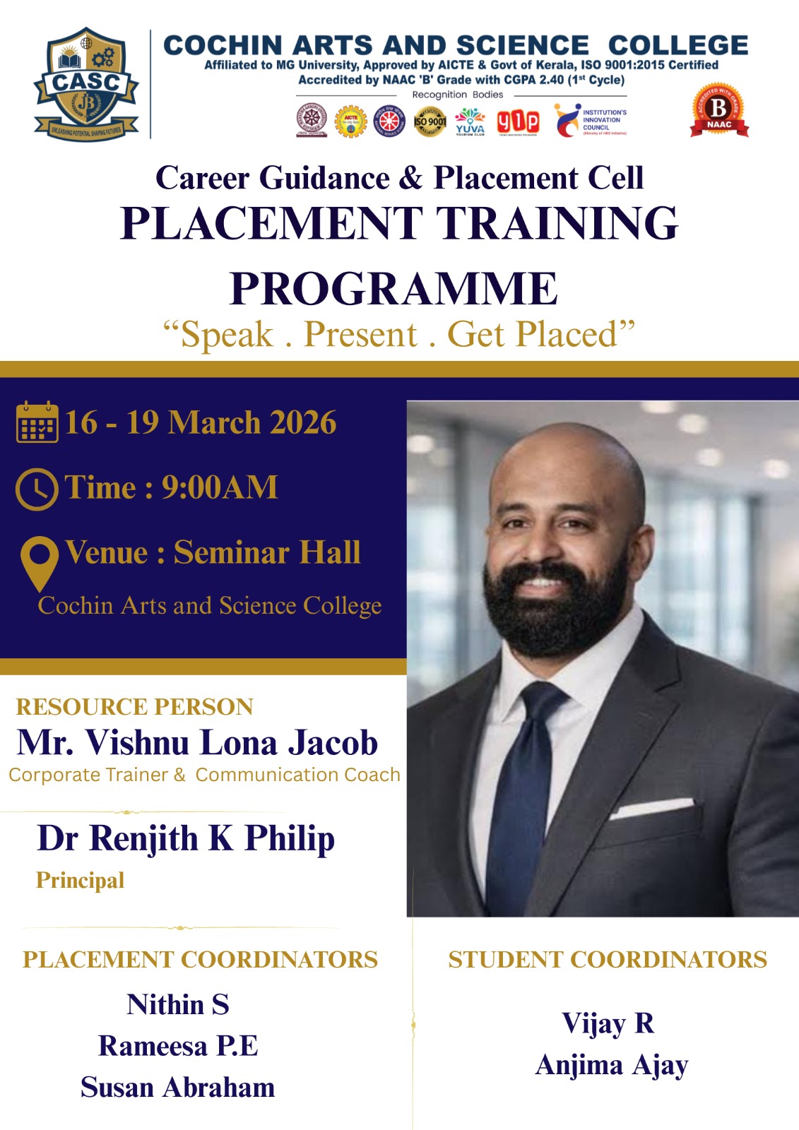 The Career Guidance & Placement Cell of Cochin Arts and Science College conducted a Placement Training Programme from 16th to 19th March 2026 at the Seminar Hall. The session was led by Mr. Vishnu Lona Jacob, Corporate Trainer and Communication Coach, focusing on improving students’ communication, presentation, and interview skills. The programme, guided by the motto “Speak. Present. Get Placed”, helped students gain confidence and prepare for future career opportunities.