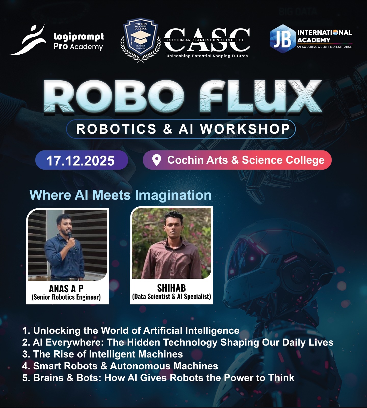 The Robo Flux – Robotics & AI Workshop is conducted by our college in association with Logiprompt Pro Academy and JB International Academy.