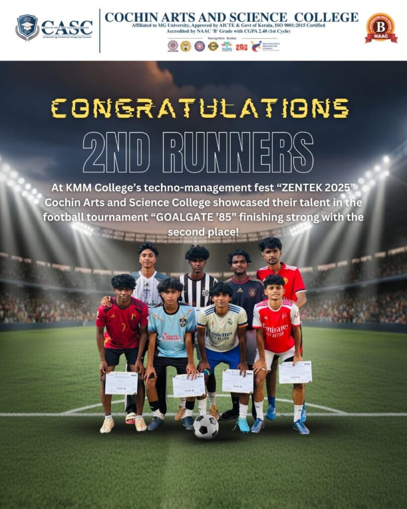 Cochin Arts and Science College football squad for securing the 2nd Runners-Up position in the “GOALGATE ’85” tournament. The team delivered a strong performance at KMM College’s techno-management fest, ZENTEK 2025, earning the coveted third place.