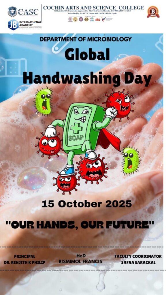 Department of Microbiology, is observing Global Handwashing Day on October 15, 2025. The event promotes the critical importance of hygiene under the theme “OUR HANDS, OUR FUTURE.” http://cochincollege.edu.in/wp-content/uploads/2025/10/WhatsApp-Video-2025-10-20-at-10.51.14-AM.mp4