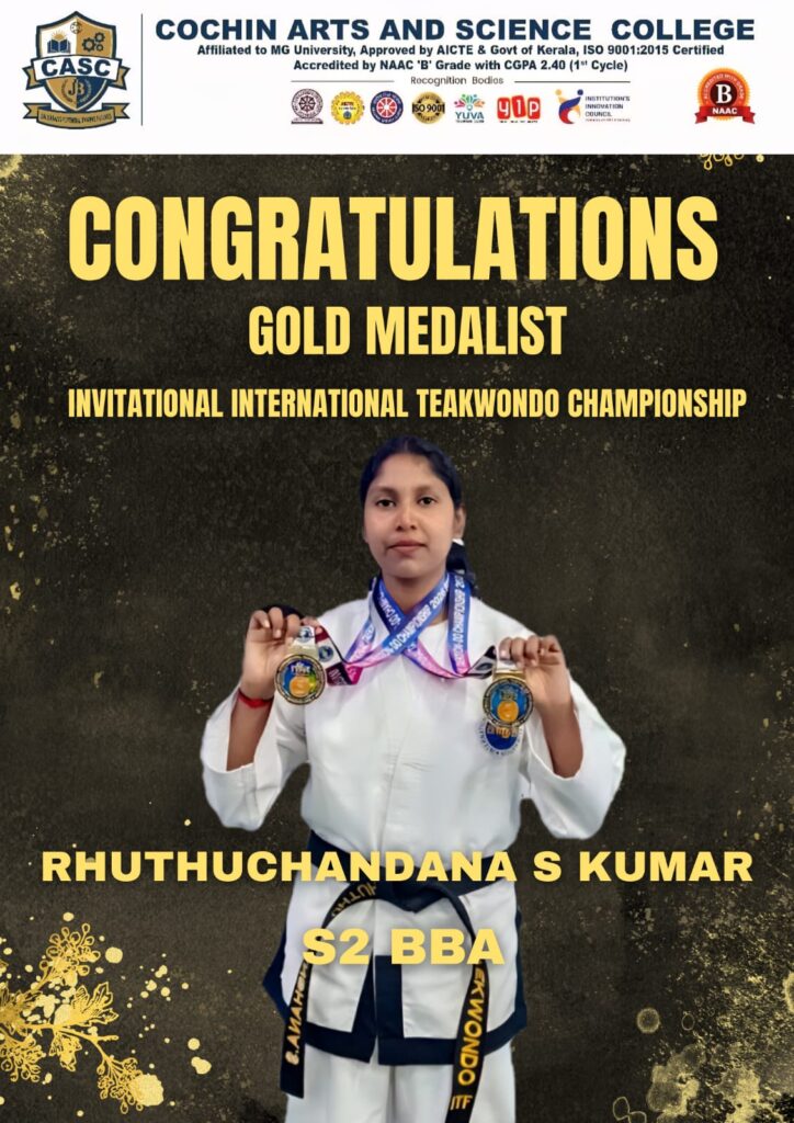 We are proud to announce that Rhuthuchandana S Kumar, S2 BBA, has won the Gold Medal at the Invitational International Taekwondo Championship. Her exceptional skill, discipline, and commitment to the sport have brought great pride and honour to Cochin Arts and Science College. The college congratulates her on this outstanding achievement and wishes her continued […]