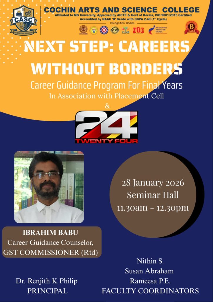 Cochin Arts and Science College, in association with the Placement Cell, organized a Career Guidance Programme titled “Next Step: Careers Without Borders” for final-year students on 28 January 2026, from 11.30 a.m. to 12.30 p.m., at the Seminar Hall. The session was led by Mr. Ibrahim Babu, Career Guidance Counselor and Retired GST Commissioner, who […]