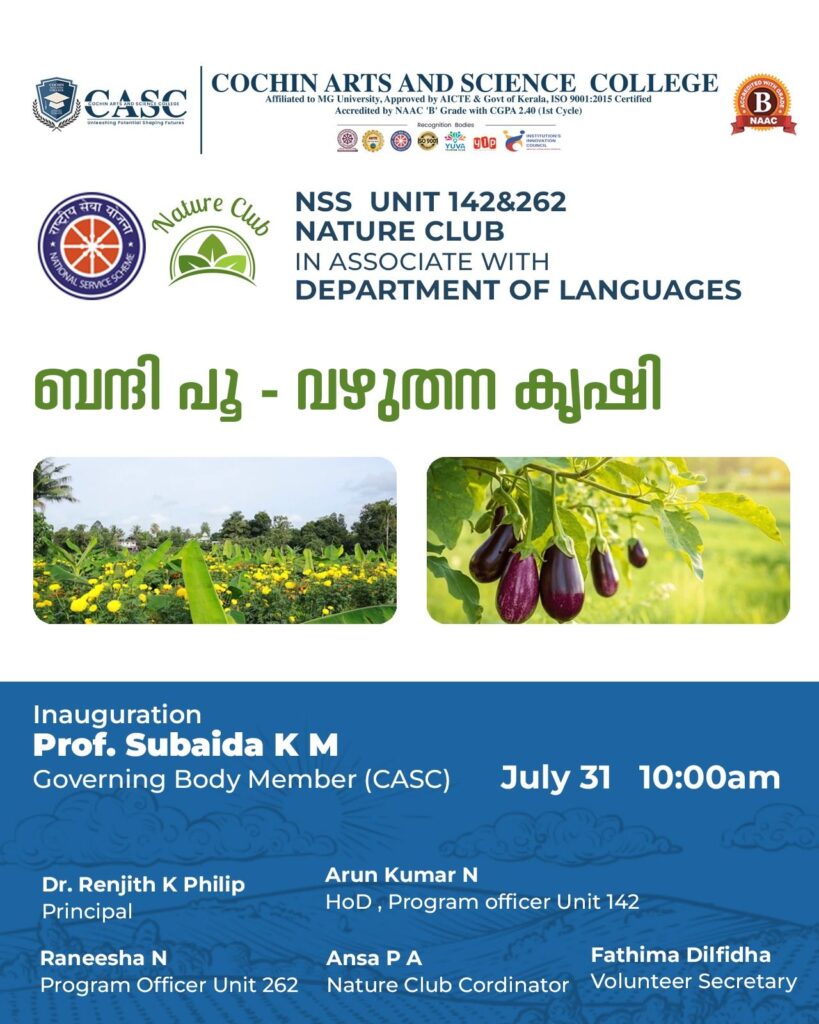 Bandi Poo – Vegetable Harvest The “Bandi Poo – Vegetable Harvest” programme, organised by NSS Units 142 & 262 and the Nature Club in association with the Department of Languages at Cochin Arts and Science College, was successfully inaugurated on 31 July at 10:00 AM. The event was inaugurated by Prof. Subaida K M, Governing […]