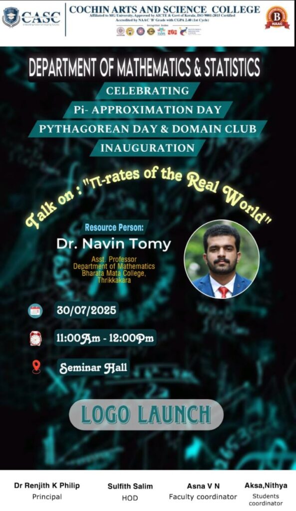 Pi Approximation Day, Pythagorean Day, and the inauguration of the Domain Club The Department of Mathematics & Statistics, Cochin Arts and Science College, celebrated Pi Approximation Day, Pythagorean Day, and the inauguration of the Domain Club on 30th July 2025. An engaging talk on “π-rates of the Real World” was delivered by Dr. Navin Tomy, […]