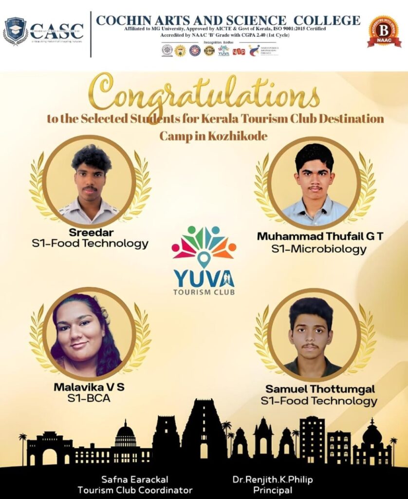 CASC Students at Kerala Tourism Camp 2025 We are proud to announce that four of our talented first-year students have been selected to represent Cochin Arts and Science College at the Kerala Tourism Club Destination Camp in Kozhikode. This achievement reflects their enthusiasm, dedication, and passion for learning beyond the classroom. Congratulations to Sreedar (Food […]