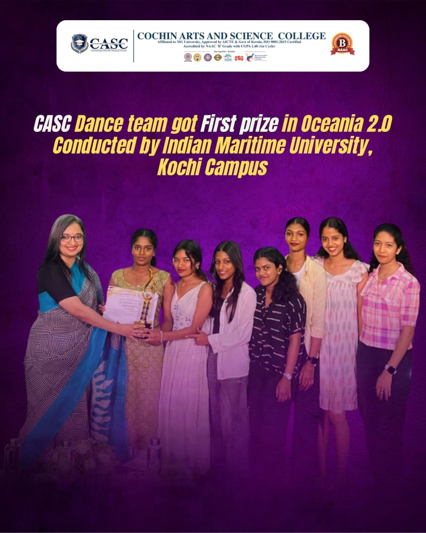 The CASC Dance Team won First Prize at Oceania 2.0, conducted by the Indian Maritime University, Kochi Campus.