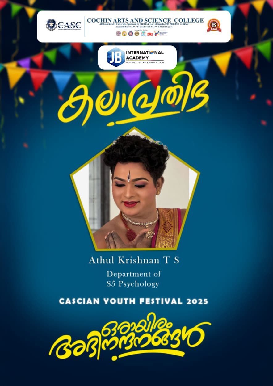 Cochin Arts and Science College celebrates Athul Krishnan T S from the S5 Psychology Department. Athul has been awarded the prestigious title of “Kalaprathibha” (Artistic Talent/Star of Arts) at the CASCian Youth Festival 2025. The entire institution offers heartfelt congratulations on this major artistic achievement.