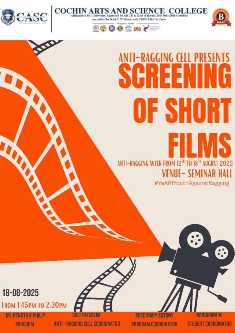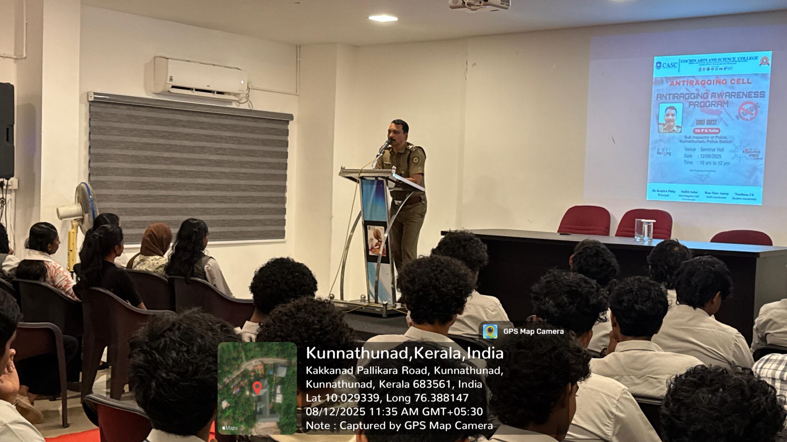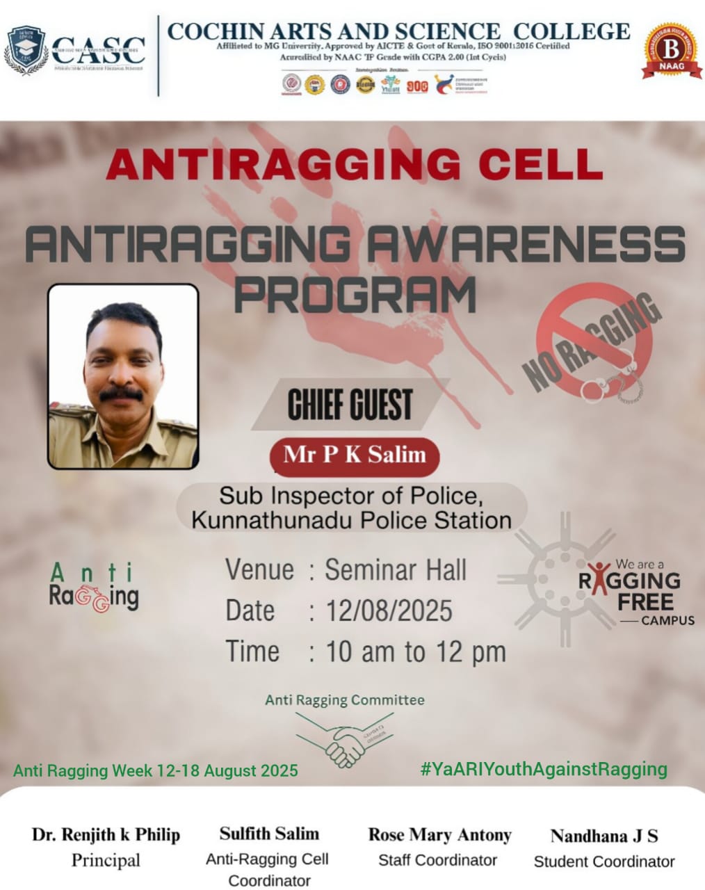 The Anti-Ragging Cell of Cochin Arts and Science College organized an Anti-Ragging Awareness Program and inauguration of Anti Ragging Week on 12th August 2025 at the college seminar hall from 10:00 am to 12:00 pm.