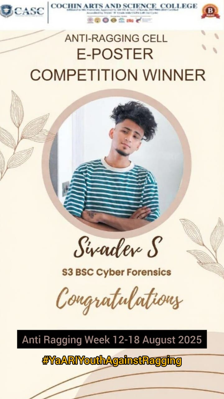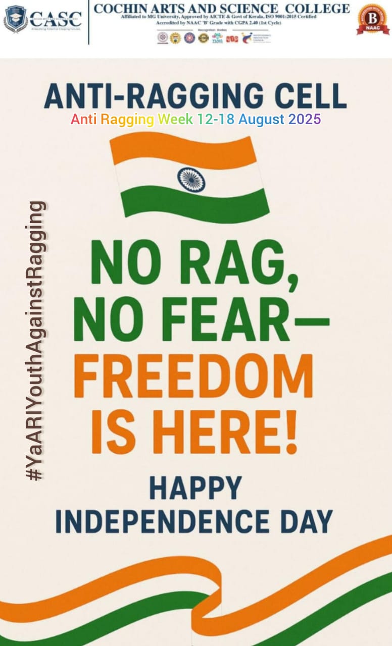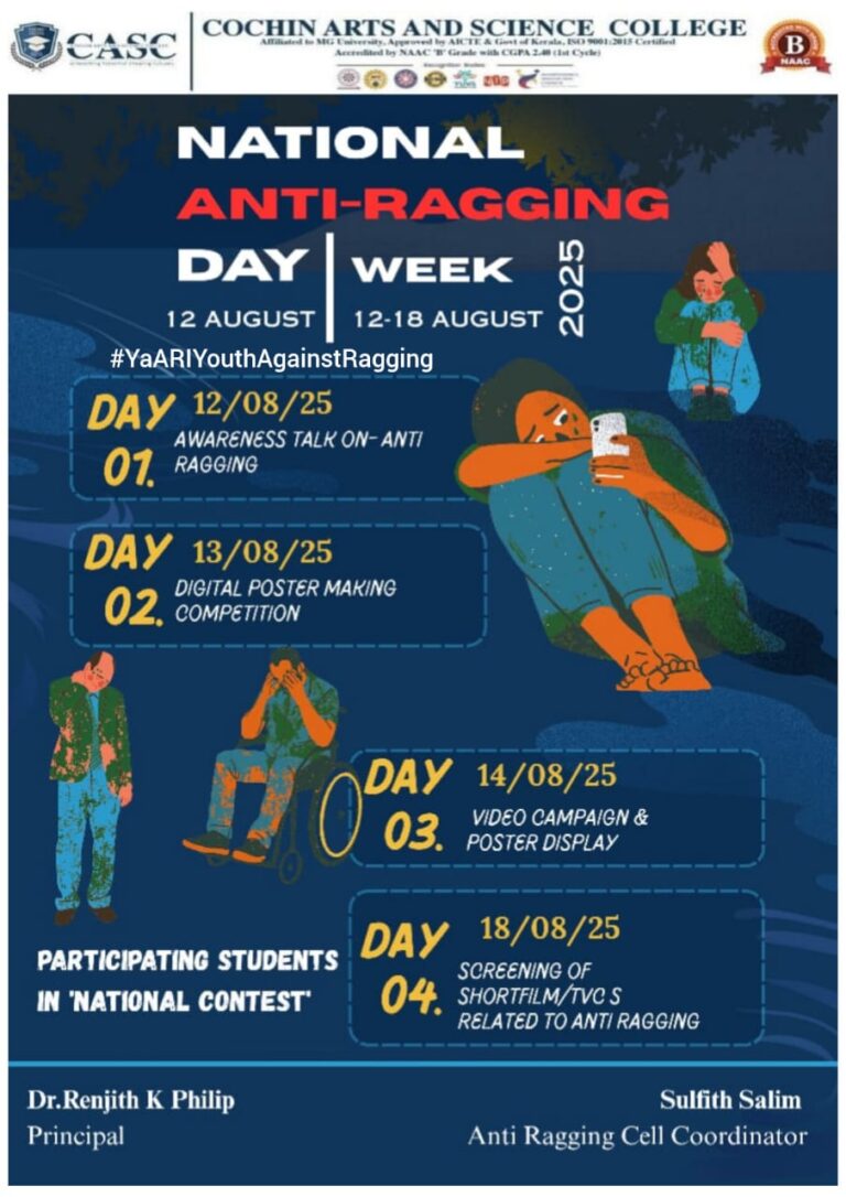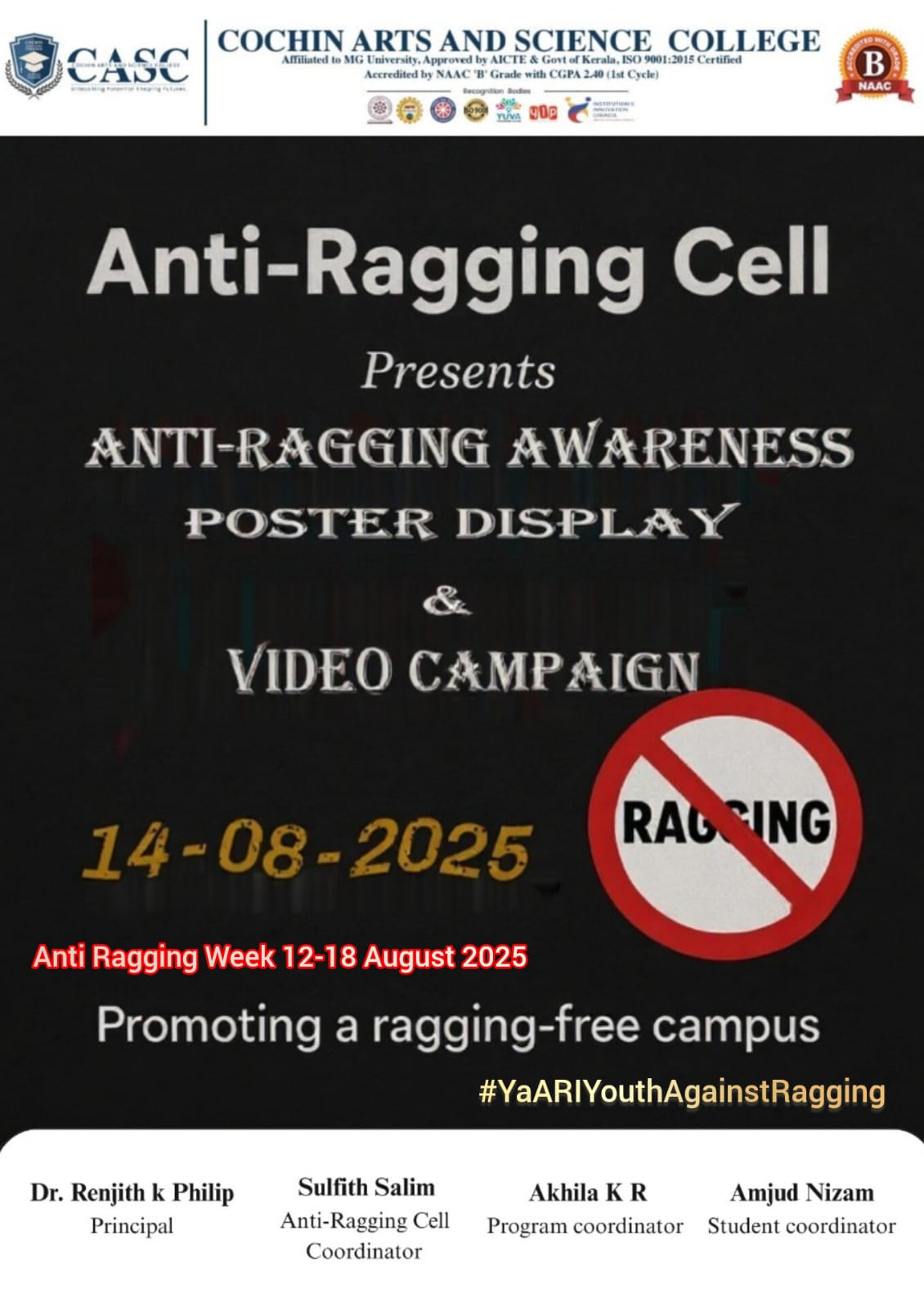 In accordance with the University Grants Commission (UGC) circular dated 22nd July 2025, Cochin Arts and Science College, Mankkakadavu, will observe Anti-Ragging Day on 12th August 2025 and Anti-Ragging Week from 12th to 18th August 2025. The initiative aims to create a ragging-free campus and promote awareness among students about the consequences of ragging.