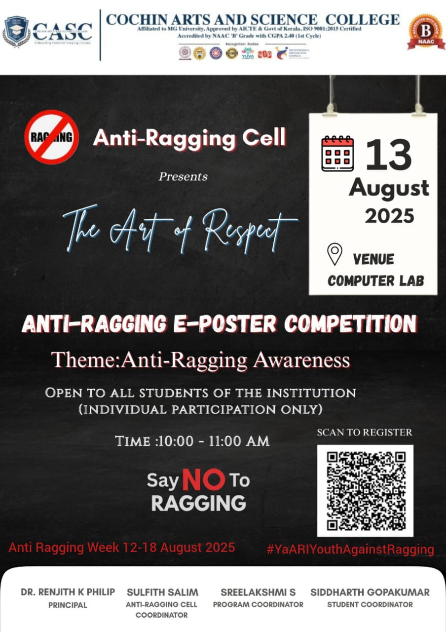 The Anti-Ragging Cell of Cochin Arts and Science College conducted an Anti-Ragging E-Poster Competition titled “The Art of Respect” on 13th August 2025 from 10.00-11.00am in the Computer Lab as part of the Anti-Ragging Week observance. The participants creatively designed digital posters to promote the message of a ragging-free campus and the importance of mutual respect.