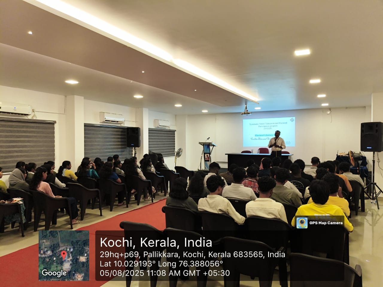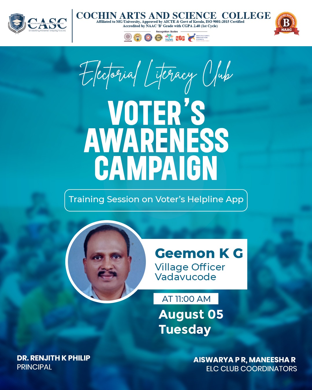 The Electoral Literacy Club of Cochin Arts and Science College successfully organized a Voter’s Awareness Campaign and training session on the Voter’s Helpline App on August 5, 2025. Mr. Geemon K.V., Village Officer, Vadavucode, delivered an informative session that enlightened our students on the importance of voter registration and electoral literacy.