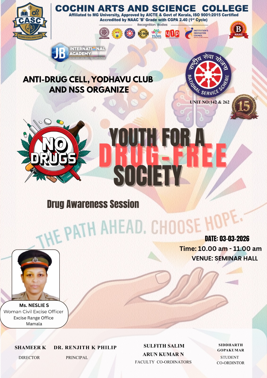 The Anti-Drug Cell, Yodhavu Club, and NSS Units (142 & 262) of Cochin Arts and Science College organized a Drug Awareness Session titled “Youth for a Drug-Free Society” on 03 March 2026 from 10:00 AM to 11:00 AM at the Seminar Hall. The programme was conducted with the objective of creating awareness among students about the harmful effects of drug abuse and promoting a culture of responsible and healthy living among youth.